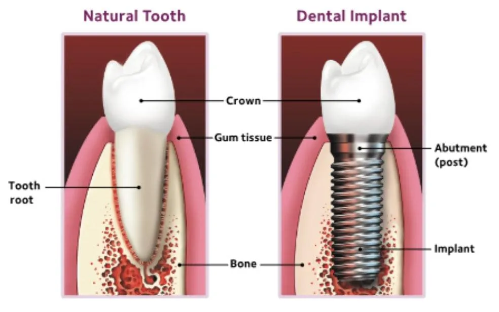A dental implant is an artificial root made of titanium metal that serves as a substitute for the root of a missing tooth. The top of the implant is attached to an artificial tooth (crown), resulting in a beautiful natural-looking replacement tooth.